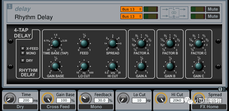 所以50%的feedback设定,表示每一声延时信号都将比之前的小6dB。25%的feedback设定,表示每一声延时信号都将比之前的小12dB。