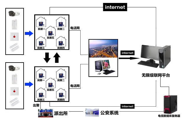 周边防范:来访者通过别墅门口机呼叫,业主确认后开门,其他非法入侵都会引起警报(别墅门口机和大门红外对射关联,开锁后撤防,上锁后,自动布防)。