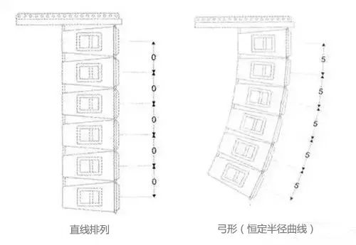 线阵列扬声器系统是由一列单元箱组成,这些单元箱按一定规则排列,根据声场需要可以排成直线、弓形(恒定半径曲线)、“J”字形和渐开线等。