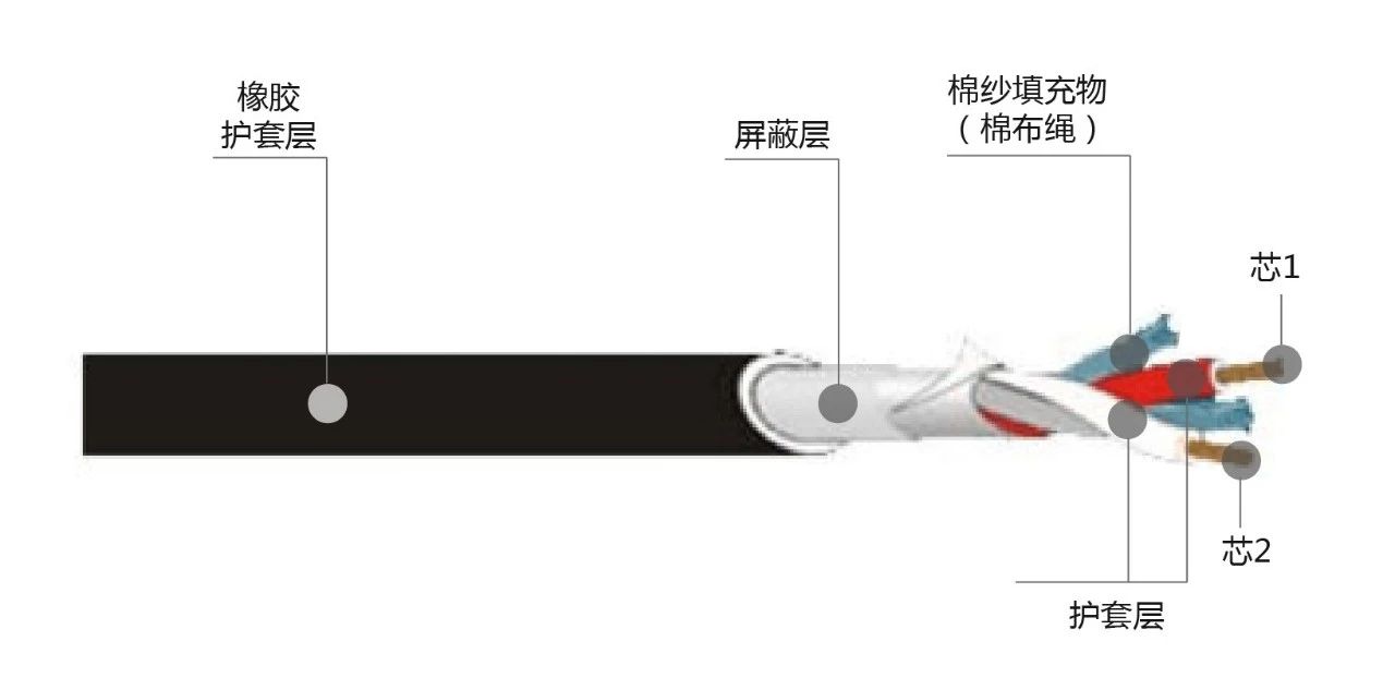 话筒线为二芯带屏蔽(按严格要求应芯及屏蔽应为无氧铜材质),每芯为若干细铜丝的结构。通常由两芯、每芯的护套层、抗拉棉纱填充物、屏蔽层及外层橡胶护套层组成。