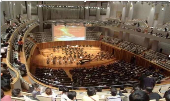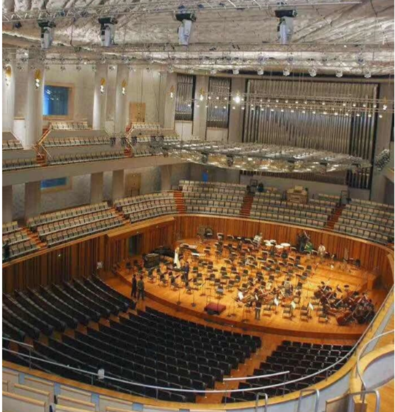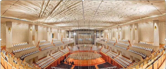 音乐厅茄子视频APP永久入口四周的墙面采用了与戏剧场类似的声学扩散墙,墙面有如站立起来的钢琴琴键,凸凹起伏、不规则排列。其凹凸的尺寸和形状经由数论精确计算得出,能扩散反射来自演奏台的声音,保障演出者良好的自我听闻和相互听闻,有利于乐队更好地发挥表演水平。音乐厅的侧墙则采用与天花板类似的声扩散装饰板,墙壁表面轻微凹凸的效果同样经过特殊设计。通过这些凹凸不平的纹理,能将声音均匀地扩散反射至音乐厅空间内的每个角落。在这些量身设计的综合作用下,音乐厅的混响时间可以达到2.2秒的优质音效。